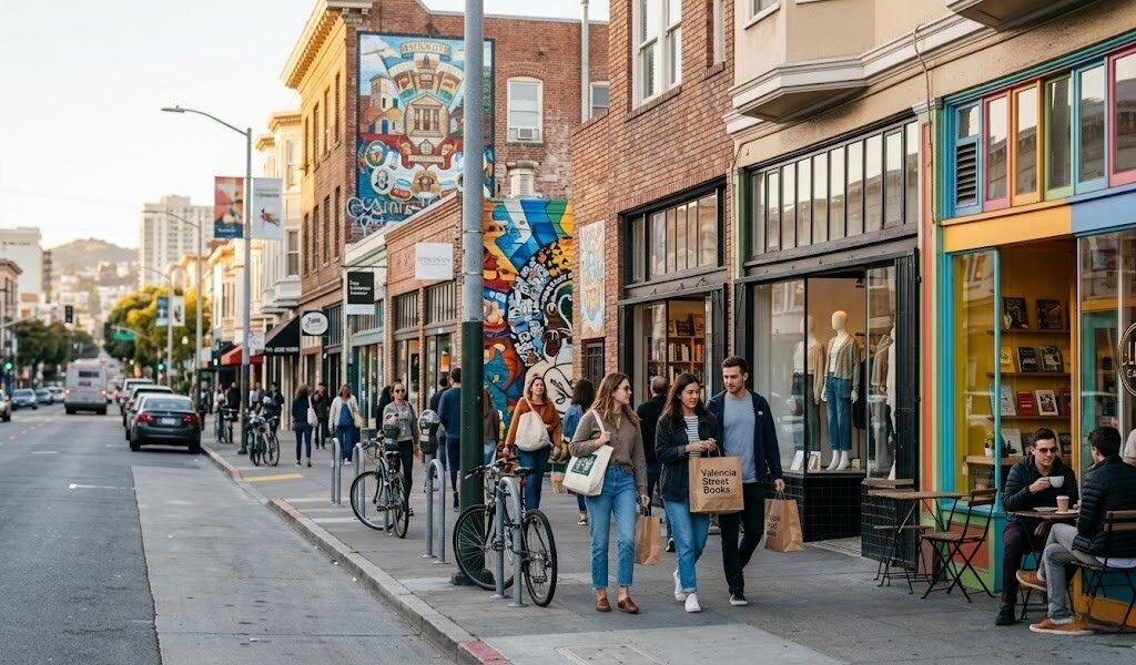 Valencia Street reflects the neighborhood’s creative energy. Visitors can browse vintage clothing stores, discover handmade crafts, or stop at cozy cafes for coffee and pastries.